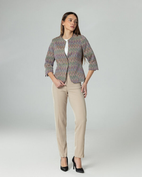 Блејзер НИКОЛИТ/6 – женски блејзер со мултиколорен дезен – модерен, впечатлив и стилски избор.