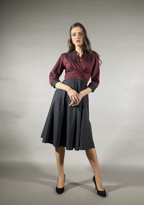 Дизајнот комбинира длабока бордо боја во горниот дел и темно сива во долниот дел, создавајќи впечатлив контраст што ја нагласува женствената линија. Кројот со вкрстен горен дел и раскошна сукња, овозможува лесно движење и истовремено внесува доза на софистицираност.