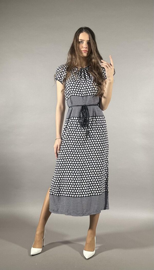 Шарениот летен дезен е избалансиран и прецизно распореден, внесувајќи свежина и динамика, а истовремено задржува уреден и софистициран изглед. Долниот дел со контрастен акцент дополнително ја нагласува должината и придонесува за елегантно движење при одење.