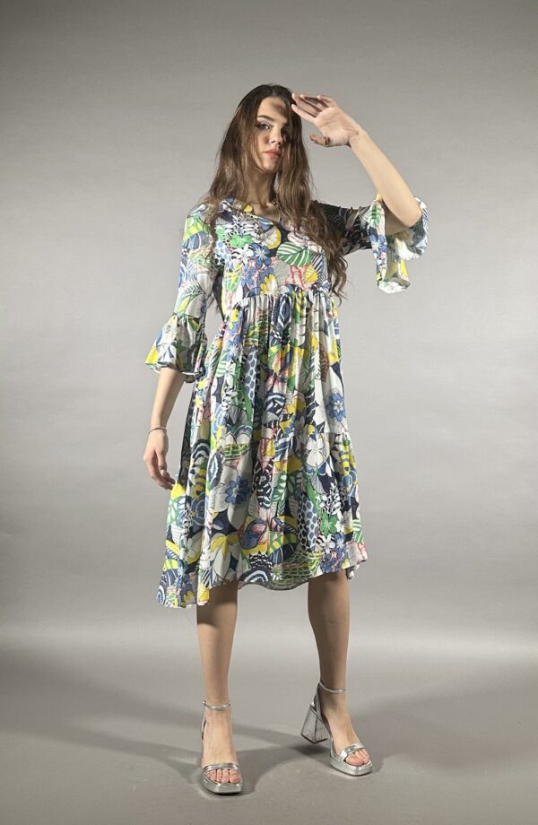Шарениот дезен му дава живост и динамика, правејќи го моделот визуелно интересен и лесно препознатлив. Опуштениот крој овозможува слобода на движење и ненаметливо паѓа по телото, создавајќи лежерен и женствен изглед погоден за различни типови фигура.