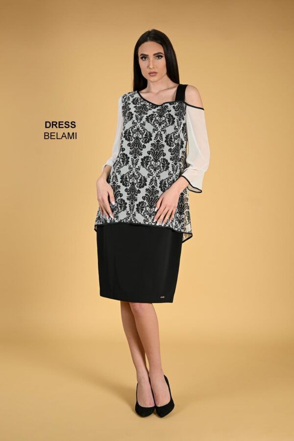 Фустан БЕЛАМИ со својот контрастен црно-бел дизајн и внимателно избалансирана форма, нуди елегантен изглед со нагласена софистицираност. Моделот е создаден за дами кои сакаат уреден, префинет стил и крој што обезбедува сигурност и комфор.