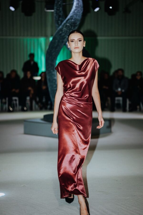 Бордо нијансата внесува топлина, самодоверба и страст, додека асиметричниот горен дел со благ набор создава софистициран баланс помеѓу модерното и класичното. Долгата силуета визуелно издолжува, а фустанот се движи елегантно со секој чекор.
