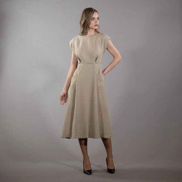 Фустан ЈАГУАР/2 е елегантен миди модел создаден за жени кои сакаат чисти линии, префинет крој и јасно дефинирана силуета. Со внимателно обликуваната половина, овој фустан ја истакнува фигурата на природен и женствен начин, без да ја наруши удобноста.