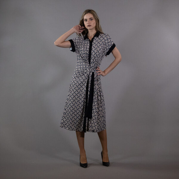 Кројот со нагласен струк и врзување овозможува индивидуално прилагодување и суптилно обликување на фигурата, додека кошулестиот горен дел внесува доза на класична елеганција и професионален карактер. Декоративниот дезен додава визуелна длабочина и стилска префинетост, без да биде наметлив.