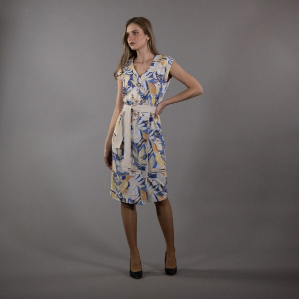 Кројот е дизајниран да ја следи линијата на телото, со нагласена половина која се оформува со појас, овозможувајќи женствена и балансирана силуета. V-изрезот дискретно го истакнува деколтето, додека должината до колена го прави фустанот соодветен и за дневни и за свечени пригоди.