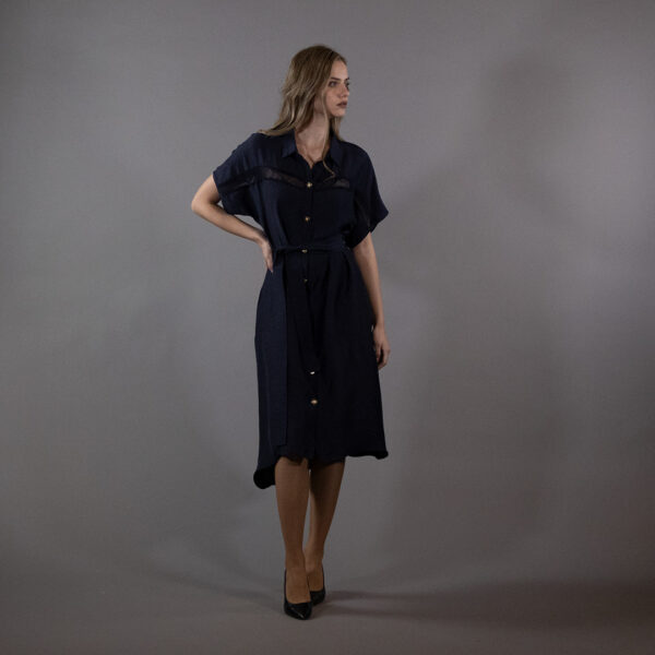 Дизајниран со копчиња по целата должина и дискретен појас во струкот, фустанот ја истакнува силуетата на природен и ненаметлив начин. Кратките ракави и должината до колена го прават идеален за носење преку целиот ден – од работна атмосфера до опуштени попладневни средби.