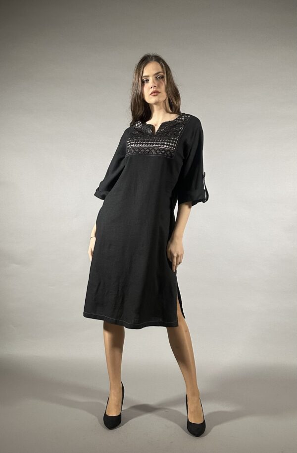 Фустан ПАРЛА/1 – ленен етно фустан е идеален избор за дами кои сакаат природен материјал, со сигурен крој и стил што прикрива, а сепак зрачи со женственост и мирна елеганција.
