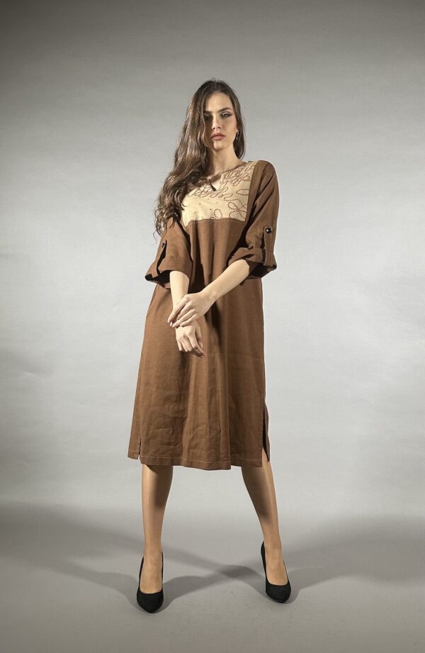 Со својот смирен етно дизајн и топли земјени нијанси, овој ленен фустан зрачи со природна елеганција и чувство на спокој. Фустан ПАРЛА/3 е создаден за жени кои сакаат облека што изгледа уредно и стилски, а истовремено нуди целосна удобност и сигурност при носење.