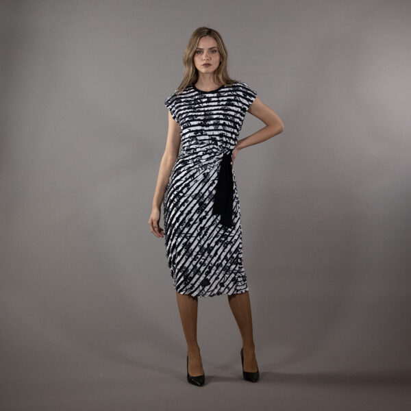 Графичкиот дезен му дава динамика и современ карактер, правејќи го фустанот впечатлив, но ненаметлив. Фустанот САМБА/11 е одличен избор за работа, дневни средби, прошетки или ситуации кога сакате да изгледате средено, женствено и самоуверено без дополнителен напор.