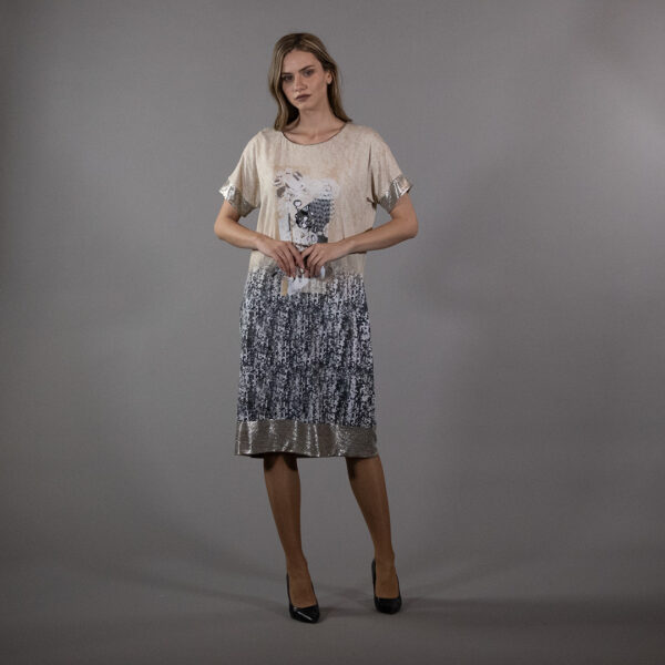 Горниот дел е со чиста и смирена линија, која овозможува дезенот суптилно да дојде до израз без да делува преоптоварено. Нежниот пад на ткаенината создава уреден и женствен изглед, додека преминот кон долниот дел внесува динамика и визуелна длабочина.
