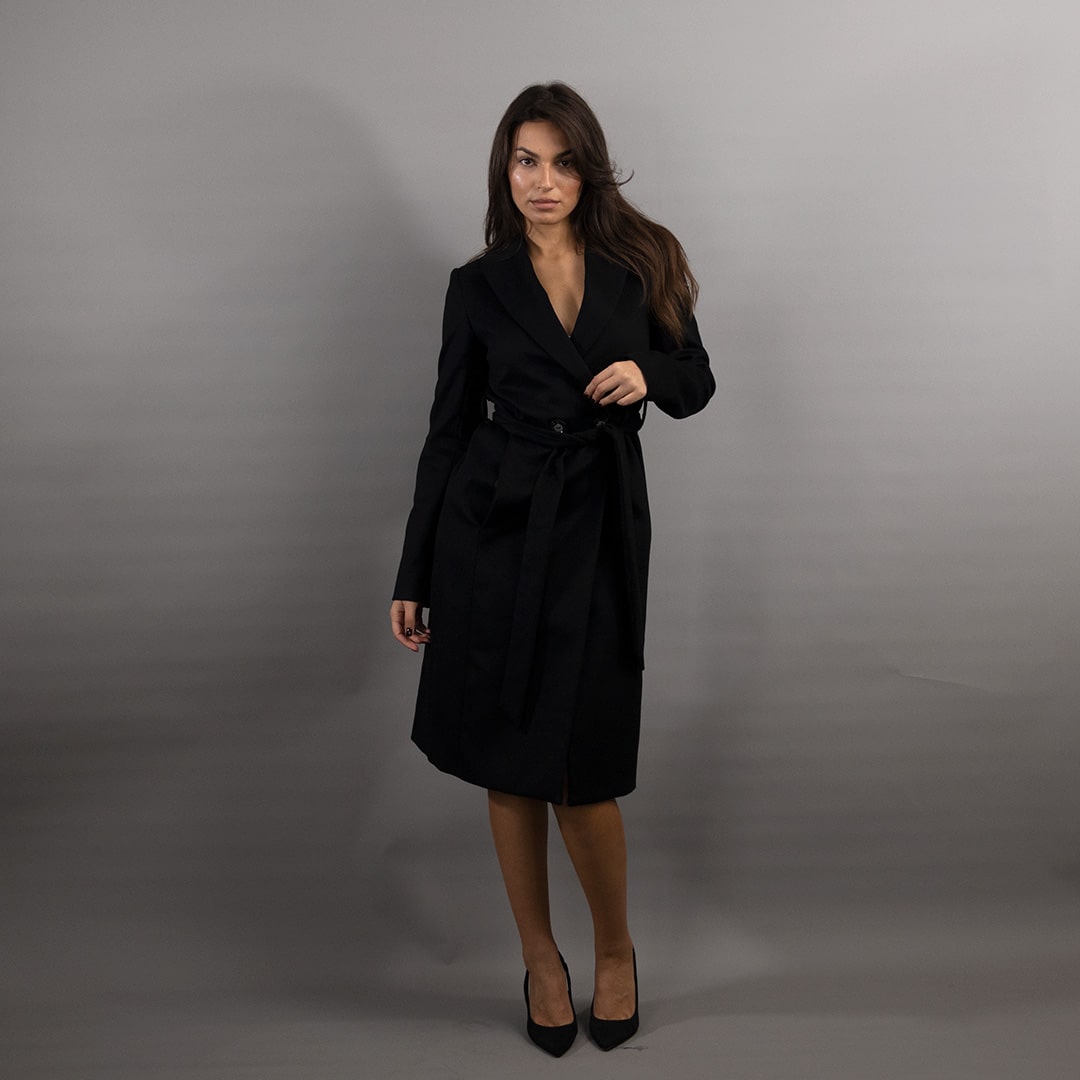 Со својот долг, прецизно скроен крој, капутот го издолжува телото и создава впечаток на софистициран минимализам. Врзувањето во половината ја нагласува силуетата и овозможува индивидуално прилагодување според фигурата.
