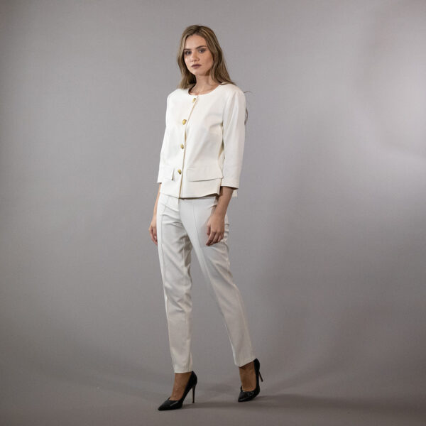 Комплет АРАГАЦ/2 е класично елегантен модел со софистициран карактер, создаден за жени кои сакаат уреден, чист и професионален изглед. Комбинацијата од панталони и шанел блејзер овозможува балансирана силуета и чувство на сигурност при носење во различни ситуации.