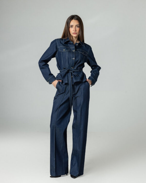 Горниот дел со структуриран крој и ремен ја нагласува женствената силуета, додека широките панталони додаваат елегантна линија и визуелна издолженост. Оваа комбинација создава баланс помеѓу удобност и стил – идеална за секојдневни урбани активности, но и за посебни прилики.