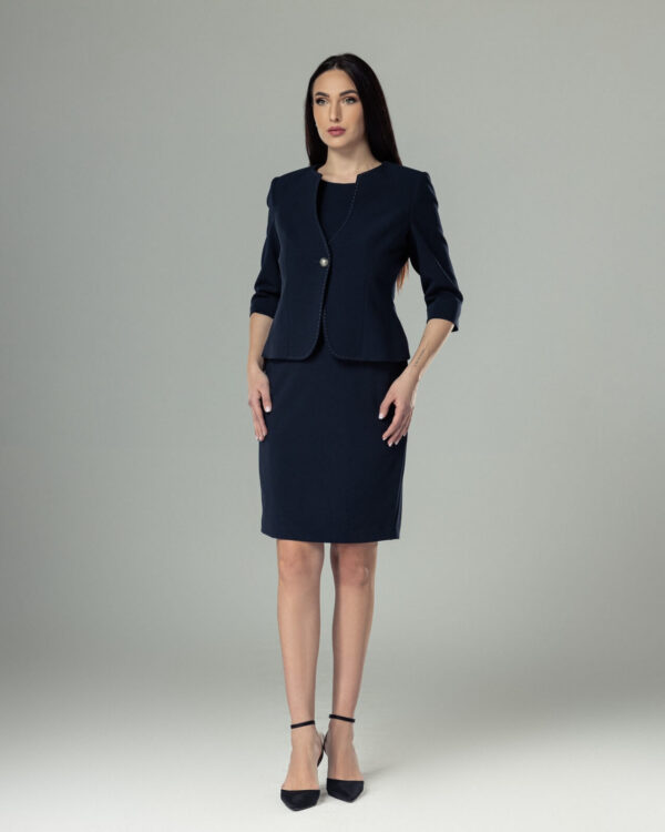 Комплетот ПЕИР/3 е создаден за жена со стил, самодоверба и јасен моден став. Со својот класичен крој и чисти линии, овој модел нуди безвременска елеганција што лесно се прилагодува на различни прилики – од деловни состаноци до свечени настани.
