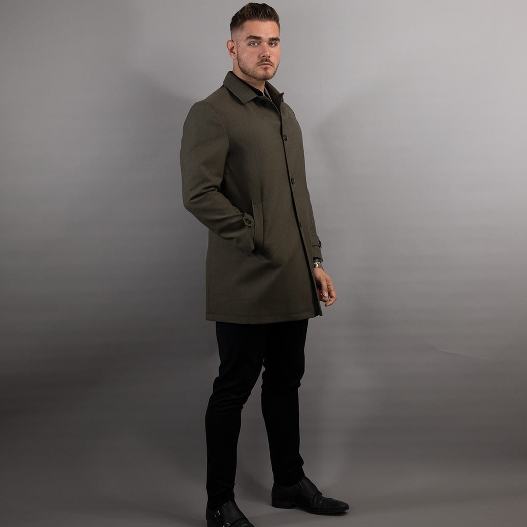 Класичен машки капут во зелена боја, изработен од волна, вискоза и полиестер – елегантен, удобен и идеален за студени денови.