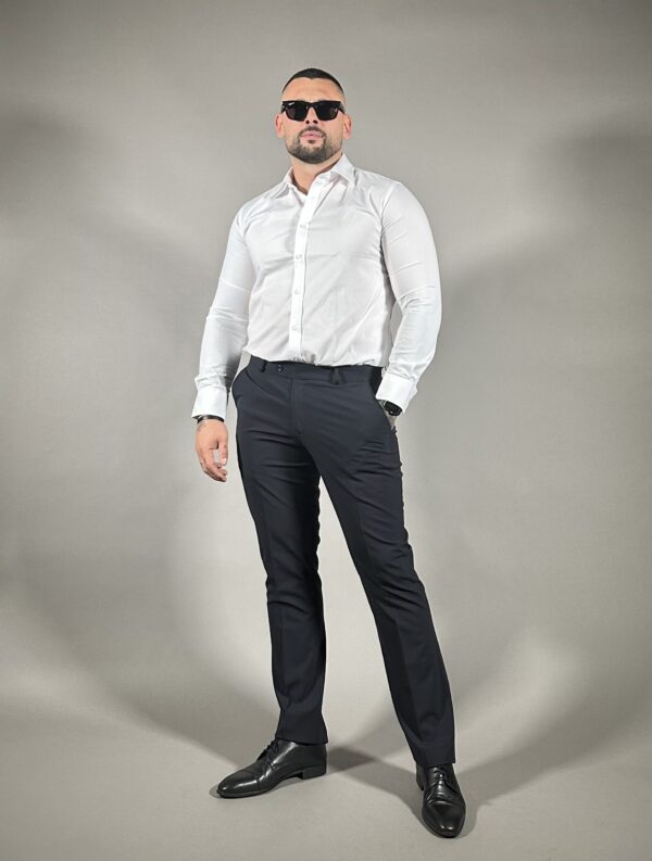 Нагласената линија и класичната силуета создаваат балансиран и професионален изглед, додека минималистичкиот дизајн овозможува лесно комбинирање со кошули, сакоа и елегантни обувки. Панталоната дискретно ја следи формата на телото, обезбедувајќи уредна појава без чувство на ограничување.
