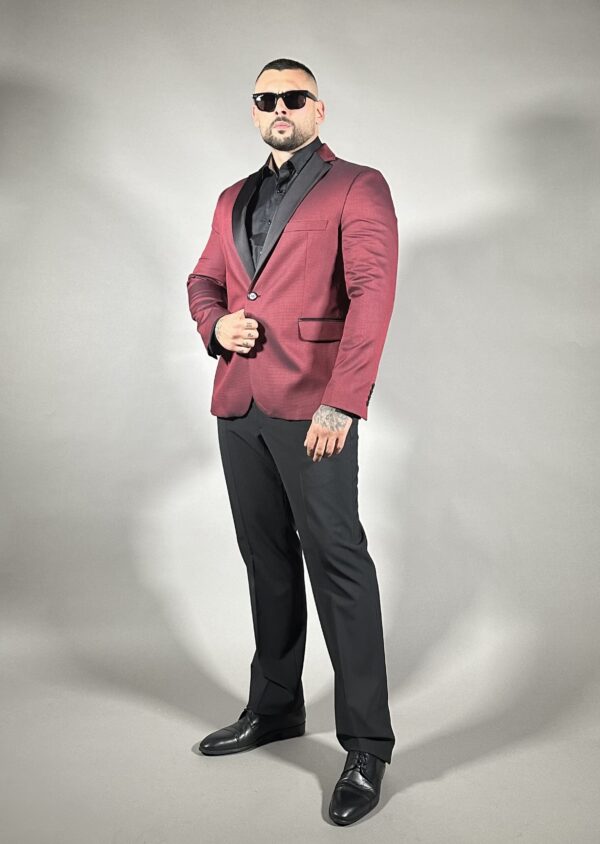 Кројот е прецизно изработен за да ја следи линијата на телото и да создаде издолжена, машка силуета. Сакото стои стабилно и елегантно, без наметливост, оставајќи впечаток на сигурност и вкус. Контрастните детали додаваат модерен акцент и го прават моделот впечатлив, но сепак софистициран.