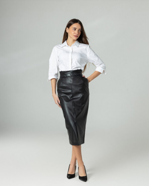 Високиот струк ја нагласува силуетата, додека правиот крој обезбедува чиста и издолжена линија. Предниот шлиц додава функционалност и динамика во движењето, правејќи ја сукњата не само стилска, туку и практична.
