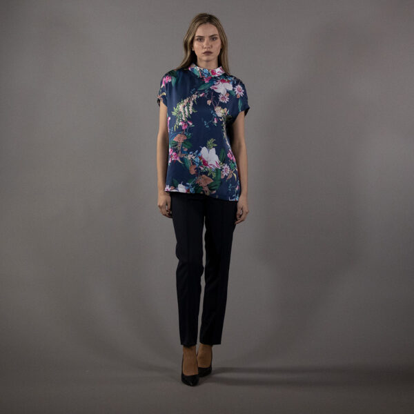 Флоралниот дезен во подлабоки, елегантни тонови создава впечатлив визуелен ефект и додава карактер на целокупниот изглед. Кратките ракави и уредниот горен дел ѝ даваат префинетост, правејќи ја туниката подеднакво соодветна за деловни и секојдневни комбинации.