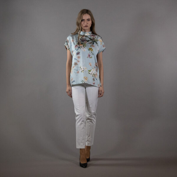 Флоралниот дезен во светли и меки нијанси додава женственост и суптилна динамика, правејќи ја туниката идеална за пролетни и летни комбинации, но и за моменти кога сакате да внесете свеж акцент во класичниот стил. Кратките ракави и уредниот горен дел придонесуваат за префинет и избалансиран изглед.