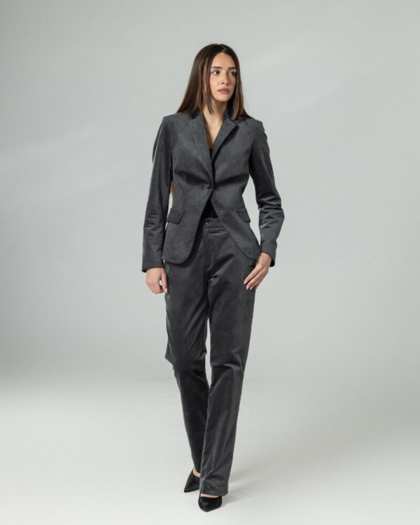 Сакото е струкирано и внимателно обликувано за да ја нагласи женската линија, додека панталоните имаат прецизен крој што обезбедува удобност и елегантен пад. Целокупниот изглед е уреден, софистициран и лесен за комбинирање.