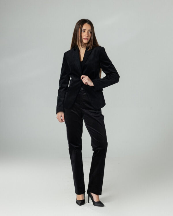 Горниот дел – класично сак0, е внимателно струкиран за да ја нагласи силуетата, додека панталоните се обликувани да обезбедат удобност и елегантен пад. Оваа комбинација создава балансиран изглед кој е истовремено професионален и модерен.